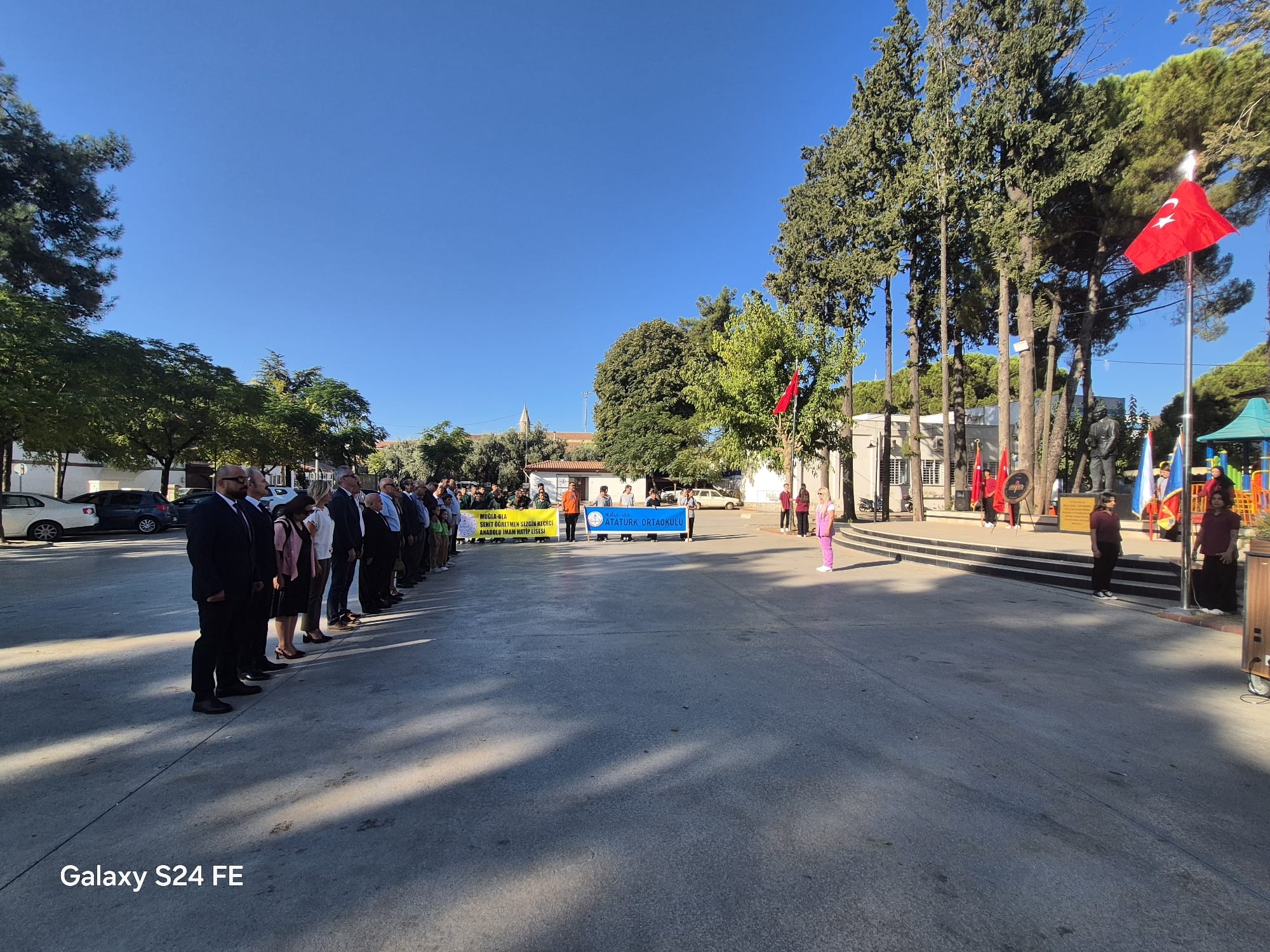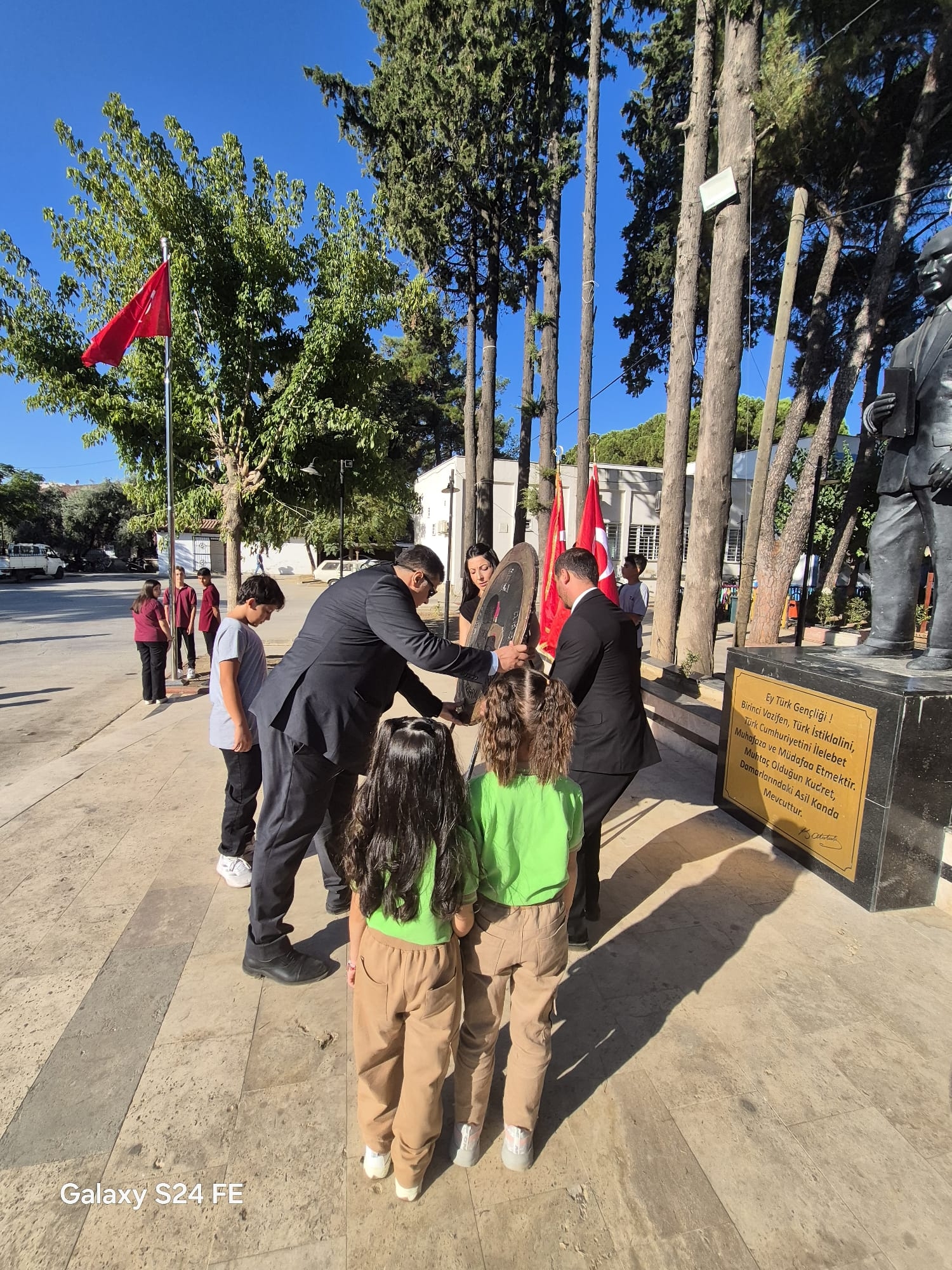 İlçe Milli Eğitim Müdürümüz Sn Cüneyt YİĞİT, Şube Müdürümüz Sn Tarık TÜFEKÇİ , ilçe protokol üyelerimiz, okul müdürlerimiz, görevli öğretmenlerimiz ve öğrencilerimizin katılımıyla gerçekleşen tören İlçe Milli Eğitim Müdürümüz Sn Cüneyt YİĞİT'in Atatürk Anıtı'na çelenk sunumuyla başladı.Saygı duruşu ve İstiklal Marşı'nın okunmasıyla devam etti.